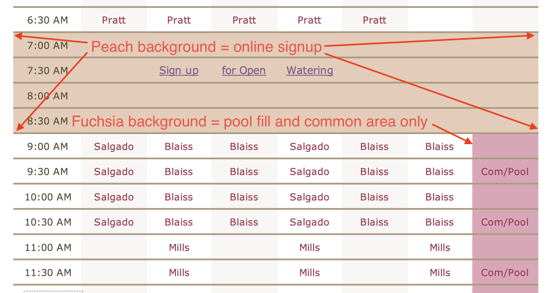 - Time blocs with fuchsia background color are reserved only for watering the common areas and for topping up the swimming pool. There should be no personal watering going on at this time.
