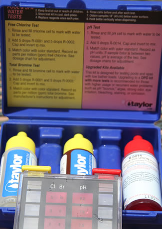 To maintain the pool in its best condition, you must test the water every day, especially during periods of heavy use. Standard procedure is to take off the yellow and the red caps from the tester and set them aside temporarily. Submerge the tester in the pool water and dump the water out a few times until you are confident the water in the testing kit is representative of the current water in the pool. With both the left (chlorine) and right (pH) tubed full to the top, a quick flick of the wrist should be adequate to lower the level of the water so its meniscus matches the fill line near the top of each tube.